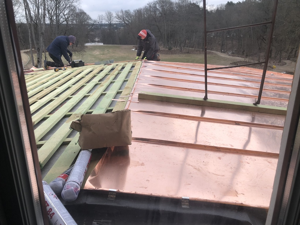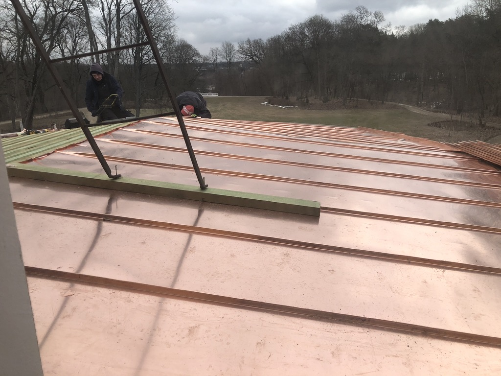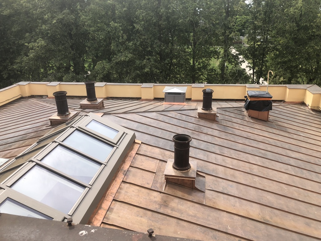 Varinės stogo dangos keitimas, metalinių stogo baliustrų ir ją laikančių stulpelių tvarkyba, ventiliacinio agregato įrengimas pastogėje